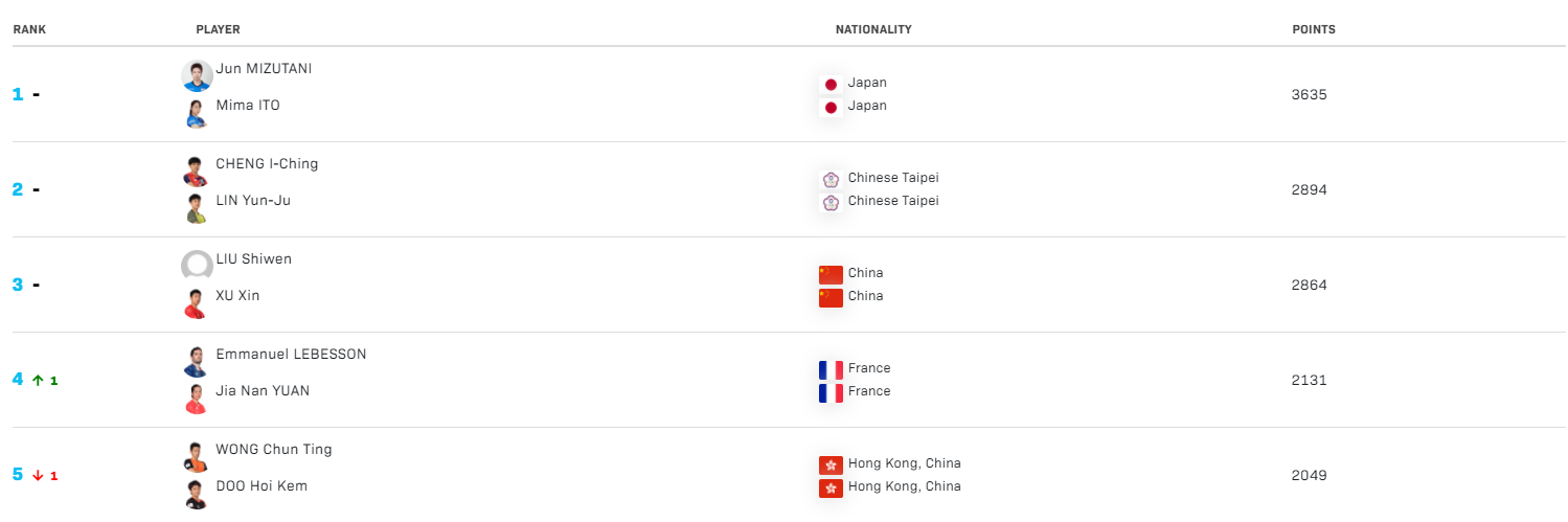 双打方面,韩国的男双组合郑荣植/李尚洙、日本强档石川佳纯/平野美宇和水谷隼/伊藤美诚分别占据男双、女双以及混双第一名。