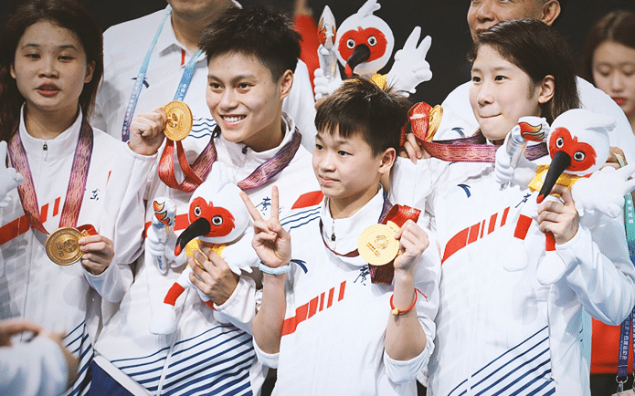 24直播网9月07日讯全运会第一个引发全民关注的项目是跳水女子团体,全红婵所在的广东队成功夺冠,河北队和东道主陕西队斩获银牌和铜牌。这其中大家关注的焦点是新科奥运会金牌得主全红婵,她的表现也很出色,在自己的10米台项目中,力压张家齐、陈芋汐等人拿下第一名,为广州队贡献413.90分。6日晚上所有比赛结束,全红婵与队友们站上最高领奖台,一起庆祝拿下全运会跳水首金。