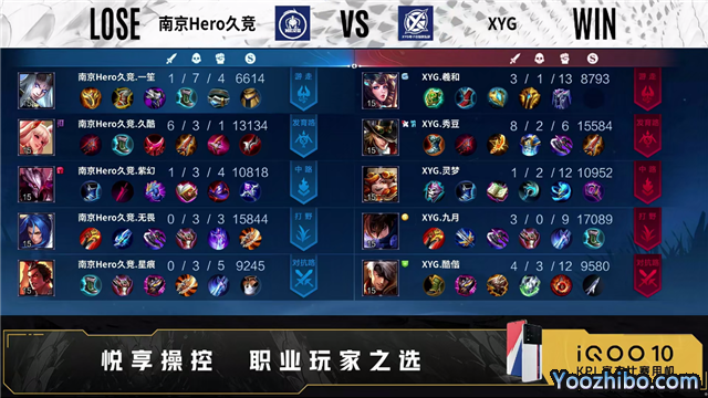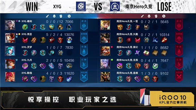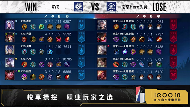第一局开局XYG成功入侵敌方野区。59秒XYG野区击杀宫本武藏拿下一血。2分50秒野区团XYG打出1换2。4分08秒XYG拿下暴君。4分24秒南京Hero久竞中路击杀镜。5分08秒南京Hero久竞摧毁敌方发育路外塔。6分06秒XYG摧毁敌方中路外塔。6分44秒XYG摧毁敌方对抗路二塔,拿下先知主宰。7分28秒XYG摧毁敌方发育路外、二塔。8分20秒野区团XYG打出0换2,摧毁敌方对抗路二塔。8分56秒XYG摧毁敌方中路二塔。9分16秒发育路团XYG打出2换3。10分53秒XYG拿下暗影主宰。11分48秒XYG摧毁敌方中路、对抗路高地塔,高地团XYG打出0换3。12分11秒XYG摧毁敌方水晶拿下比赛。