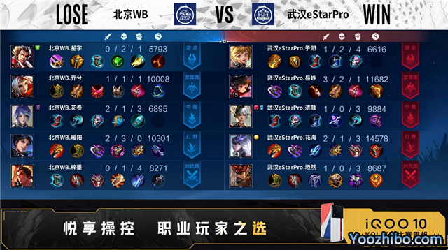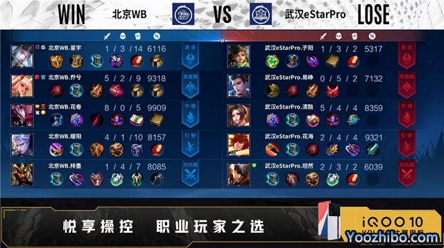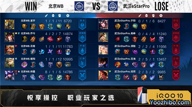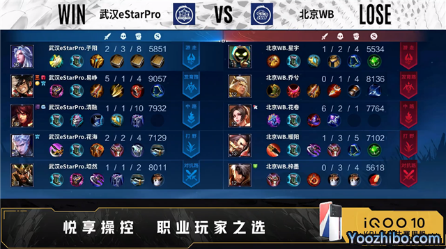 双方常规开局。1分14秒武汉eStar入侵野区未果,北京WB击杀桑启拿到一血。2分11秒双方发育路射手1换1。3分40秒北京WB拿下暴君。3分45秒武汉eStar对抗路击杀关羽。6分01秒双方主宰处1换1。7分56秒野区团战北京WB打出0换5。8分27秒发育路团战武汉eStar打出1换3。9分48秒北京WB中路击杀裴擒虎。10分59秒武汉eStar野区击杀公孙离。11分11秒北京WB发育路击杀狄仁杰。12分38秒北京WB摧毁敌方对抗路高地塔。13分10秒北京WB强点水晶拿下比赛。