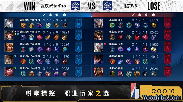 双方常规开局。3分12秒北京WB野区击杀东皇太一拿到一血。5分21秒武汉eStar拿下主宰。6分23秒武汉eStar摧毁敌方发育路外塔。7分26秒武汉eStar对抗路打出0换2。8分01秒武汉eStar拿下暴君。9分10分26秒武汉eStar拿下暗影暴君。12分25秒武汉eStar拿下暗影主宰。13分26秒武汉eStar摧毁敌方中路二塔。14分03秒野区团战武汉eStar打出1换3。14分38秒武汉eStar摧毁敌方发育路高地塔。15分21秒武汉eStar拿下暗影暴君。15分33秒武汉eStar对抗路击杀马可波罗。16分08秒高地团战双方2换2,武汉eStar摧毁敌方中路高地塔。18分27秒武汉eStar对抗路打出1换2。19分12秒武汉eStar摧毁敌方水晶拿下比赛。
