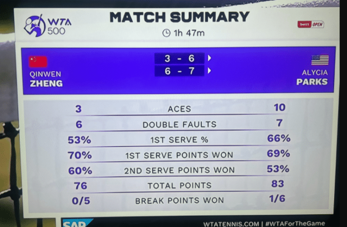 首盘,郑钦文在第4局便遭到破发。随后的第5局,虽然郑钦文一度制造4个破发点,但全部未能把握。在经过6次平分后,帕克斯保发取得4-1领先。随后,两人各保发球局,帕克斯6-3先胜一盘。第二盘,郑钦文在第7局挽回0-40的不利局面,艰难保发。两人战至抢七,抢七中帕克斯5-0开局,最终拿下抢七,爆冷取胜。