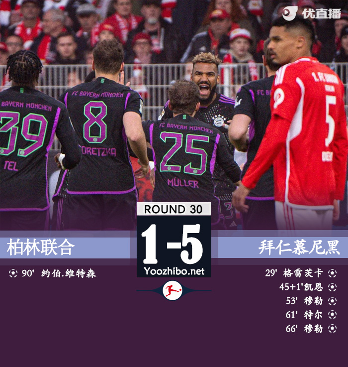 第90分钟,柏林联合界外球机会,维特森拿球突入禁区低射得手,拜仁5-1柏林联合。