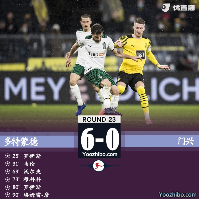 24直播网 2月21日讯 北京时间2月21日0点30分,德甲第23轮,多特蒙德主场对阵门兴。上半场,罗伊斯传射,马伦破门,科贝尔多次贡献扑救,雷纳伤退。下半场,霍夫曼射中门框,罗伊斯助攻沃尔夫和穆科科替补破门后自己再度打入一球,沃尔夫造点,埃姆雷詹点射破门。全场比赛结束,多特蒙德6-0大胜门兴。