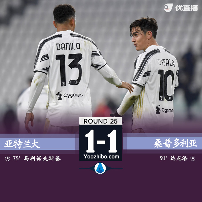 北京时间2月14日凌晨3:45,2021-22赛季意甲联赛第25轮,尤文图斯客场挑战亚特兰大。上半场两队均无建树,下半场莫拉塔失良机,弗拉霍维奇爆射被斯波蒂耶洛扑出,马利诺夫斯基世界波破门,达尼洛补时绝平,最终尤文图斯1-1战平亚特兰大。