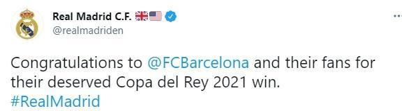 皇马官方发文写道:“祝贺巴萨和巴萨球迷们获得2021年