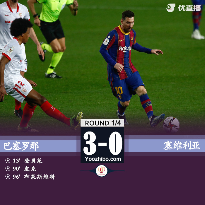 最终全场比赛结束,巴萨3-0,总比分总分3-2塞维进决赛。