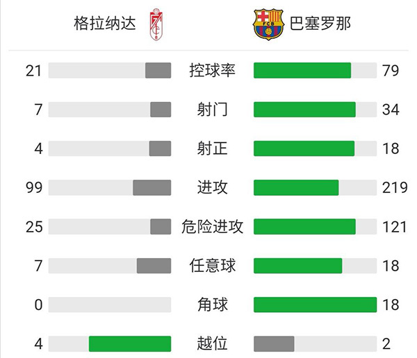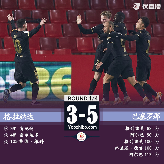全场比赛结束,巴塞罗那客场5-3战胜格拉纳达。
