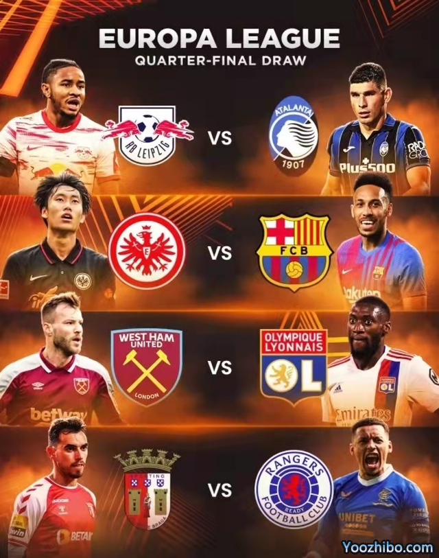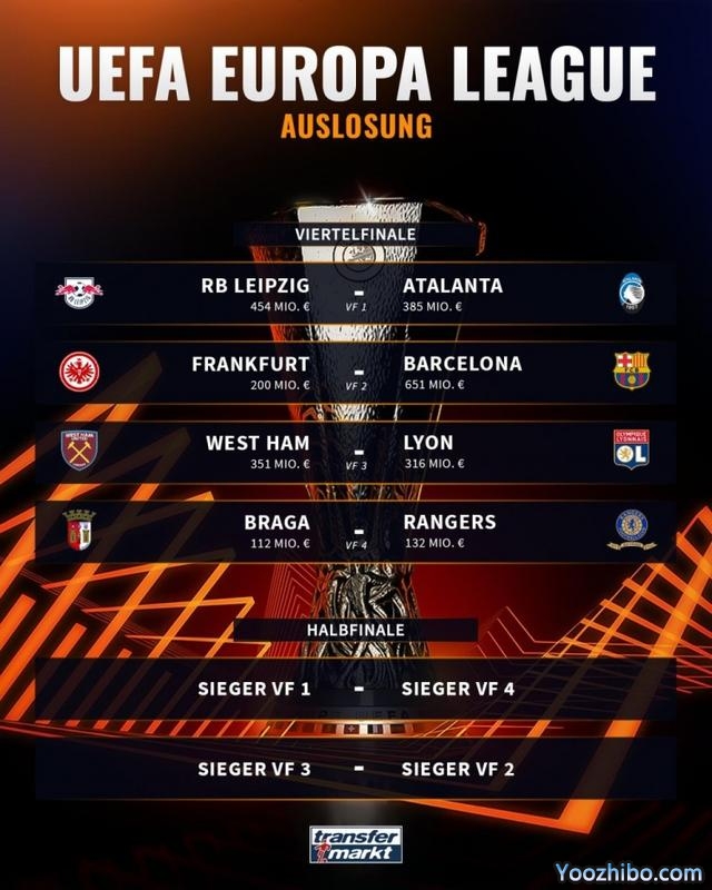 欧联杯1/4决赛对阵(排名在前的球队先踢主场):