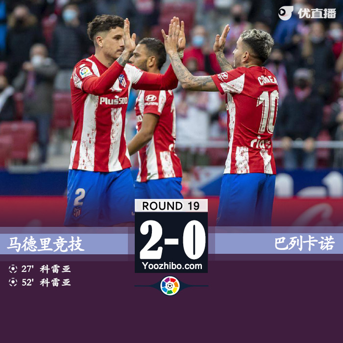 北京时间1月2日23:15,西甲联赛第19轮,马竞主场迎战巴列卡诺的比赛,上半场科雷亚补射破门,下半场科雷亚完成梅开二度,最终,马竞2-0巴列卡诺。