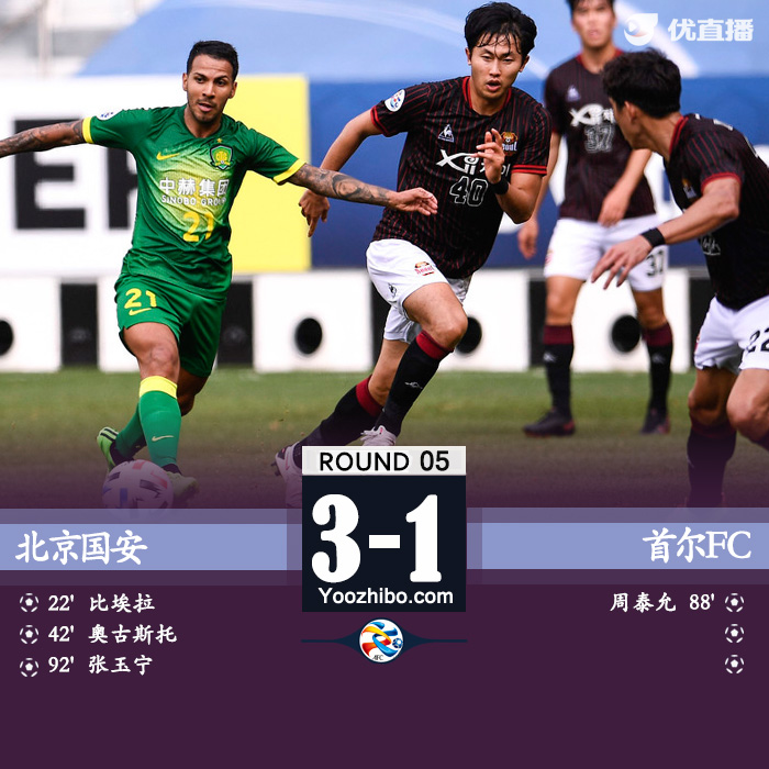 24直播网讯:北京时间11月30日晚,亚冠小组赛E组赛事继续进行,北京国安3-1战胜首尔FC,国安以5连胜表现提前锁定小组头名。第23分钟,国安任意球巧妙配合,比埃拉将球打进;第43分钟,王刚右路传中,奥古斯托以飞身凌空的精彩动作斩获入球;第89分钟,尹柱泰为首尔追回一球;补时阶段张玉宁单刀球破门。