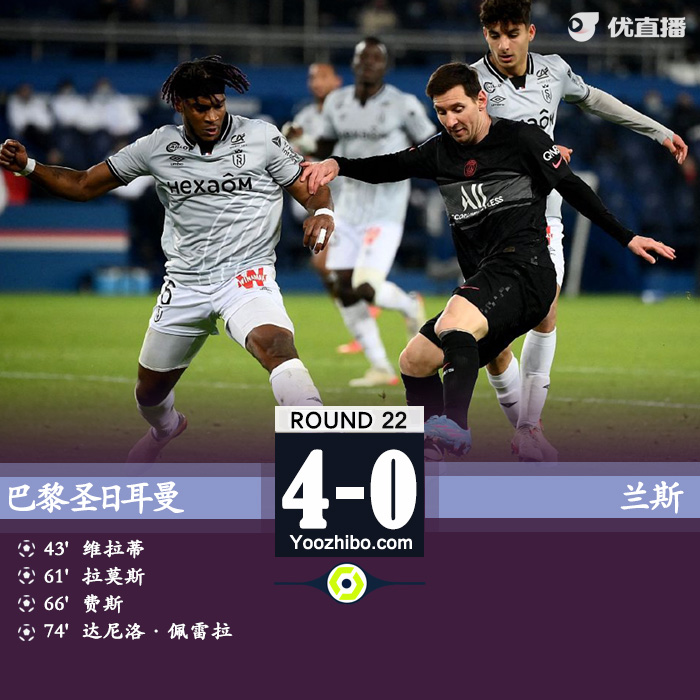 北京时间1月24日凌晨03:45,法甲第22轮继续进行,巴黎圣日耳曼主场迎战兰斯。上半场,维拉蒂补射帮巴黎取得领先。下半场,拉莫斯打进处子球扩大比分,梅西替补上场策动维拉蒂制造乌龙球,姆巴佩助佩雷拉再打进一粒乌龙。最终,巴黎4-0大胜兰斯,11分优势领跑积分榜。