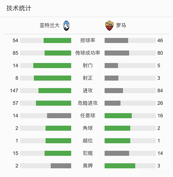 查看:亚特兰大vs罗马 全场录像技术统计: