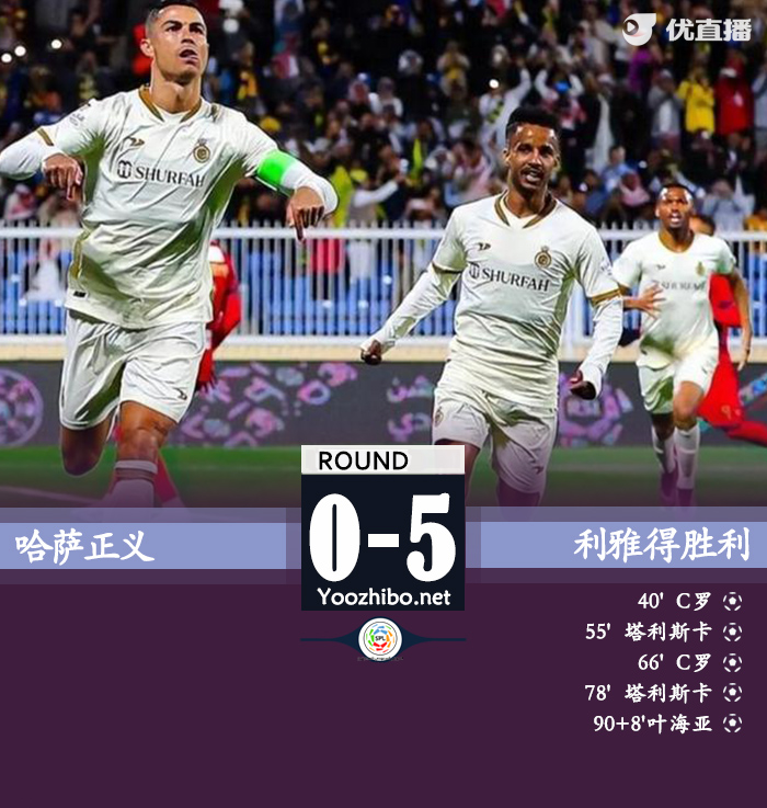 北京时间4月5日03:00,沙特联赛第22轮利雅得胜利挑战哈萨正义的比赛,上半场阿姆里造点,C罗点射破门,下半场塔利斯卡、C罗均完成双响,叶海亚补射建功,最终利雅得胜利客场5-0大胜哈萨正义。