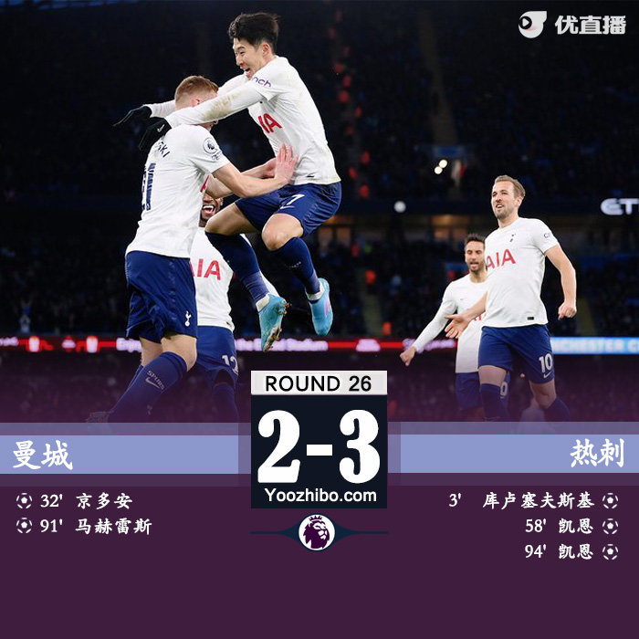 北京时间2月20日凌晨1:30,2021-22赛季英超第26轮焦点赛,曼城坐镇主场迎战热刺。上半场,孙兴慜单刀助攻库卢破门,京多安补射扳平。半场战罢,曼城暂1-1热刺。下半场,孙兴慜助攻凯恩进球,凯恩破门被吹,89分钟B席造点马赫雷斯主罚命中,95分钟库卢助攻凯恩头球绝杀。全场结束,曼城2-3热刺惨遭赛季双杀。