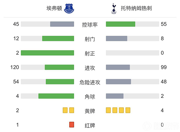 全场比赛结束,热刺0-0闷平埃弗顿。