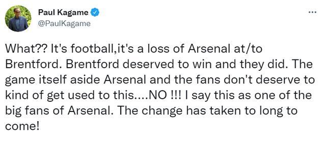 24直播网讯 北京时间8月14日,阿森纳在英超揭幕战中0-2不敌升班马布伦特福德。作为阿森纳球迷的卢旺达总统保罗-卡加梅在个人社交媒体上表达了不满。