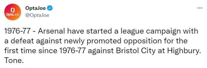 1976-77赛季的联赛首轮,当时阿森纳在主场海布里球场输给了升班马布里斯托城。