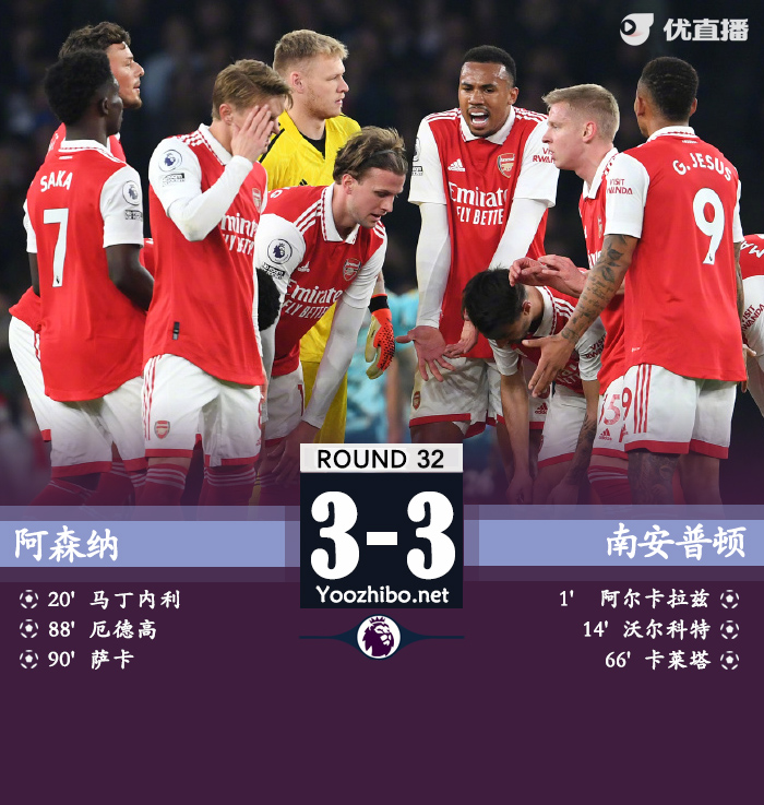 北京时间4月22日03:00,英超联赛第32轮阿森纳迎战南安普顿的比赛,上半场拉姆斯代尔开场送礼阿尔卡拉斯抽射破门,随后沃尔科特推射建功,马丁内利凌空爆射扳回一城,半场结束,阿森纳1-2南安普顿。下半场卡尔头球扩大比分,厄德高远射破门,萨卡补射扳平。最终,阿森纳3-3南安普顿三轮不胜。