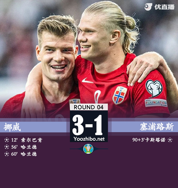 北京时间6月21日凌晨2点45分,欧洲杯预选赛小组赛第4轮展开一场较量,挪威主场对阵塞浦路斯。上半场,索尔洛特传中,索尔巴肯抽射打破僵局。下半场,哈兰德点射得分。随后,厄德高助攻哈兰德再下一城。读秒阶段,卡斯坦诺斯攻入安慰性进球。全场比赛结束,挪威3-1击败塞浦路斯,拿下本届欧洲杯预选赛首场胜利。