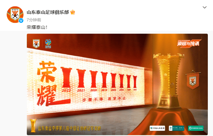 山东泰山俱乐部官微发文:荣耀泰山,并附上山东泰山夺得8次足协杯冠军年份图。