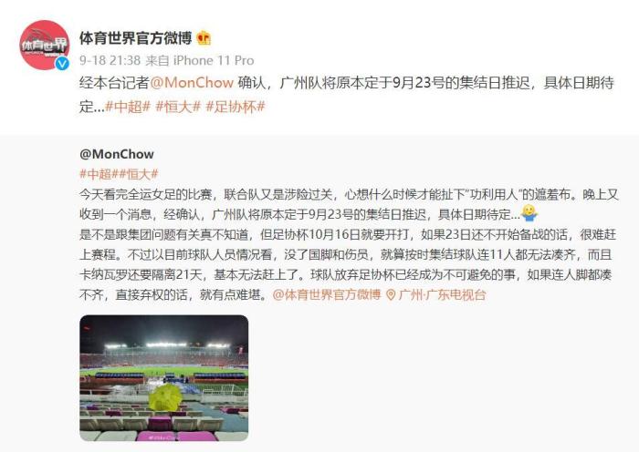 24直播网9月19日讯 广州队原计划9月23日集结,但目前已经推迟,具体日期待定。